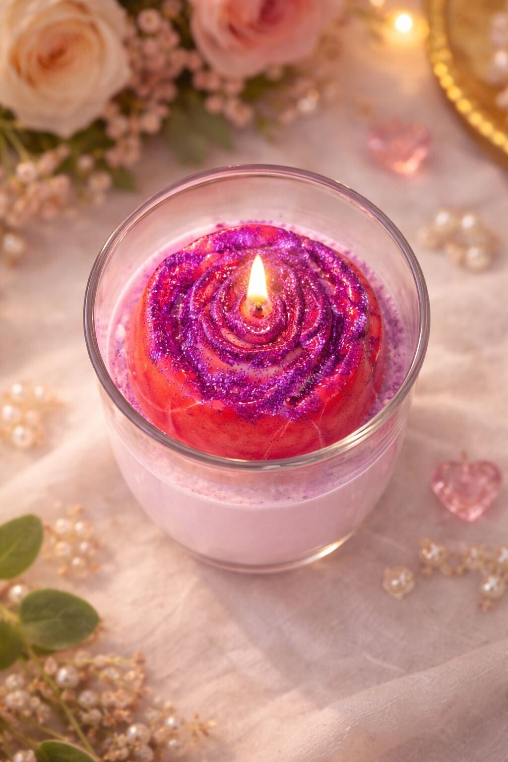 Vela artesanal en vaso de cristal con diseño de rosa en relieve, en delicados tonos rosa y fucsia (color al azar) con destellos brillantes. Su acabado romántico y elegante la convierte en el detalle perfecto para decorar cualquier espacio, crear un ambiente cálido y aportar un toque sofisticado y acogedor a tu hogar. Ideal para regalar o consentirte con un momento especial. ✨🌹
